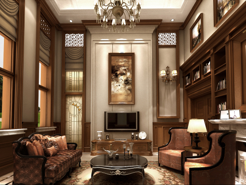 工程說明:別墅設計不僅僅考慮的是別墅居住者的生活習慣及各種風格的搭調,同時還要考慮別墅設計的外在元素。地面大理石拼鋪,深色木質扶手的家具,挑空的層高,歐式的壁爐和歐式木質造型,整個客廳空間就營造出一種沉穩大氣的氛圍。帶著美式風格的粗獷大氣和韻味,